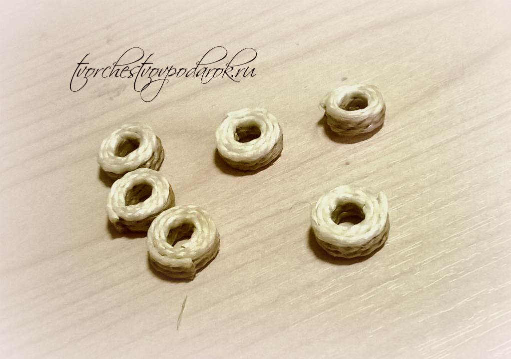 - Нарезать несколько отрезков джутовых шнура на равные части по 20 сантиметров. Такая длина удобна для изготовления мелких шаблонных деталек, которые составляют идею основного рисунка.
