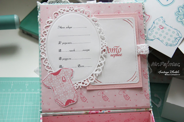 - Внутри на крышке создаём кармашек. Туда можно складывать разнообразные вырезки и фото с надписями. А также не забываем распечатать заготовку с именем и фамилией ребёнка.