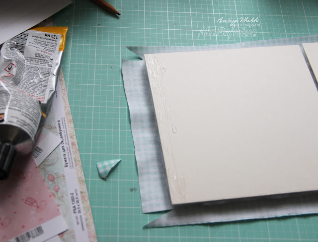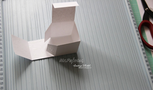 - Следующим шагом мы наносим клей на вверх стенок коробочки, чтобы закрепить на них ткань.
