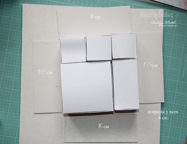 - Делаем заготовки шаблонов для коробочек, всего три одинаковых вида, но разных размеров. Они должны выглядеть таким образом: